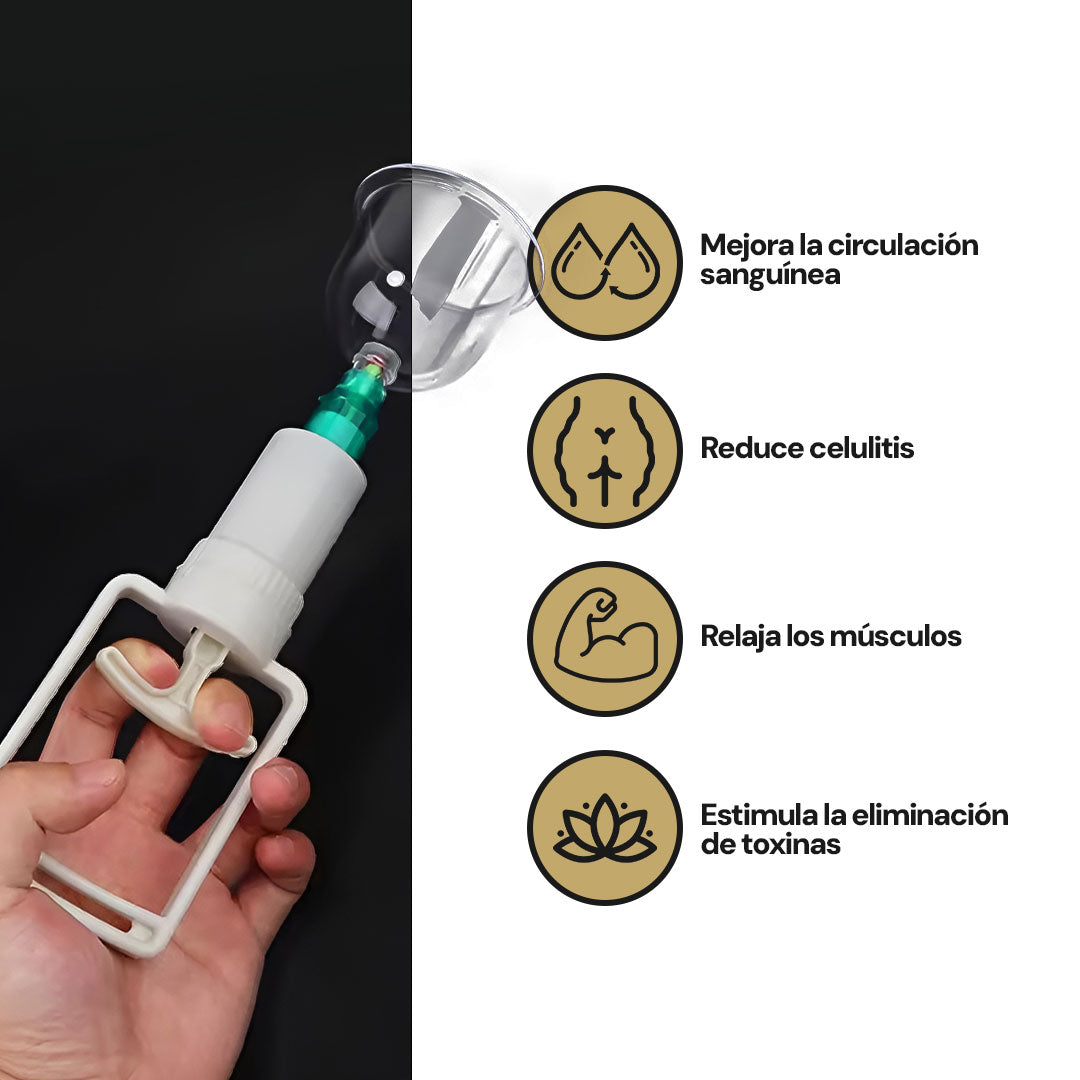 Alivia tensiones musculares, mejora la elasticidad de tu piel y elimina toxinas acumuladas. Con 6 ventosas de vacío, el kit de Vacunterapia es la mejor forma de cuidar tu salud y belleza