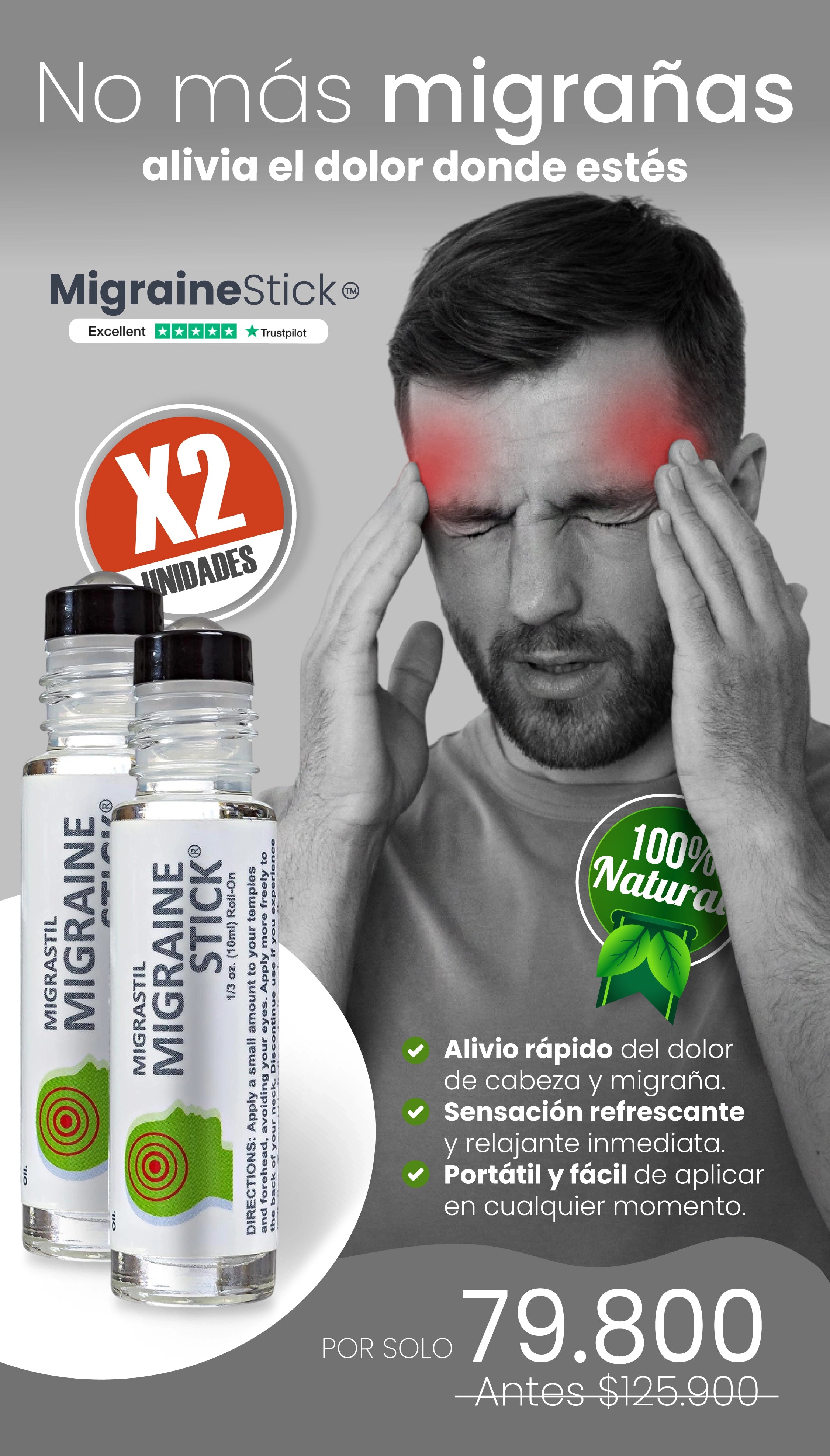 Aplica directamente en las sienes, frente o parte posterior del cuello con movimientos circulares suaves.